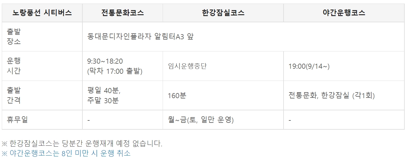 노랑풍선시티버스가 운행하는 전통문화코스, 한강잠실코스, 야간운행코스는 현재 한강잠실코스가 임시운행중단 중이며 동대문디자인플라자 알림터 A3앞에서 출발하며 09:30에서 18:20까지 평일 40분, 주말 30분 단위로 운행 중이며 야간운행코스는 19시 1회에 한하여 운행 중에 있으며 8인 미만시 야간운행코스는 운행이 취소 됩니다.