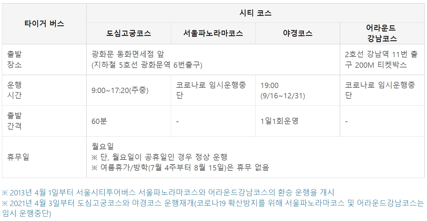 도심고궁코스, 서울파노라마코스, 야경코스, 어라운드강남코스는 타이거버스로 이동하며 현재 중단된 서울파노라마코스, 어라운드강남코스를 제외한 도심고궁코스와 야경코스는 광화문 동화면세점 앞(지하철 5호선 광화문역 6번 출구)에서 출발하며 운행시간은 도심고궁코스가 09시에서 17시 20분까지 매 60분 간격으로 운행하며 야경코스의 경우 12월 31일까지 19시에 1일 1회에 한하여 운행을 하고 있습니다.