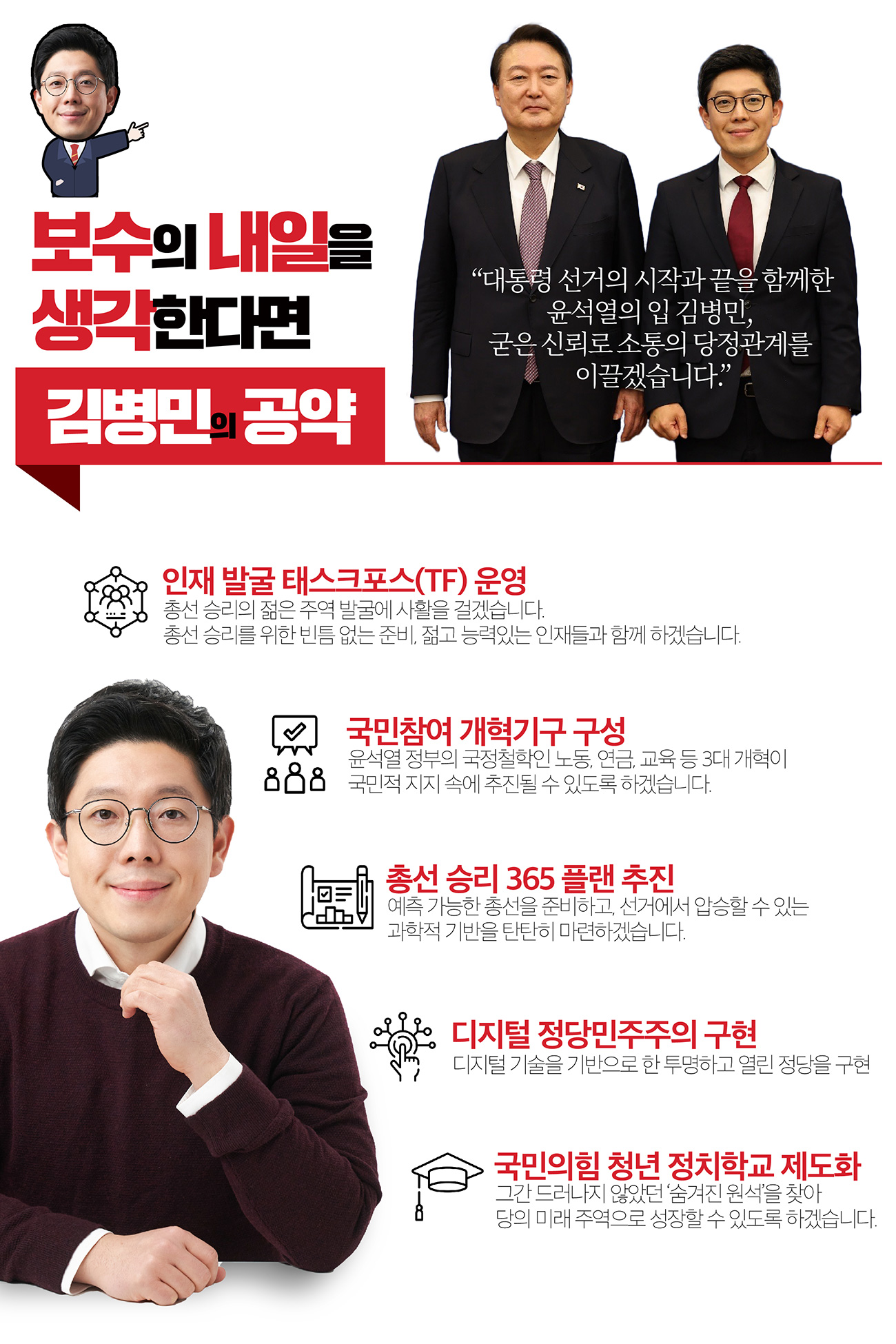 직을 두고 정치를 한 경험은 많지 않지만 당직과 방송 활동을 통하여 정치 활동을 한 김병민 당협위원장은 이번 최고위원 출마에 총선 승리 위한 ‘국민 인재 발굴 TF 운영’, 국민참여 개혁기구 구성, 총선 승리 365플랜 추진, 디지털 정당 민주주의 구현, 국민의힘 청년정치학교 제도화 등을 공약으로 내세워 본선 진출을 노립니다.