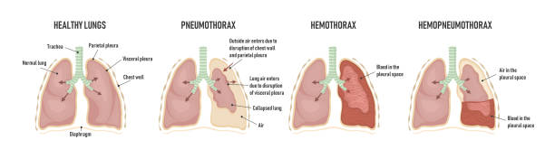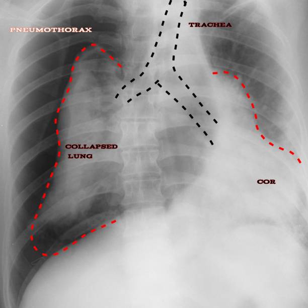 기흉(pneumothorax)은 폐와 흉부벽 사이에 공기가 쌓이는 상태를 말합니다. 이는 폐가 공기로 가득 차면서 폐가 축소되고 압축되어 발생합니다. 이러한 압축으로 인해 폐의 기능이 저하되며 호흡 곤란, 가슴 통증 등의 증상을 유발할 수 있습니다.